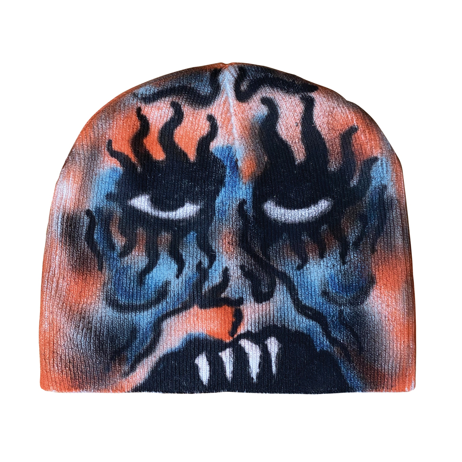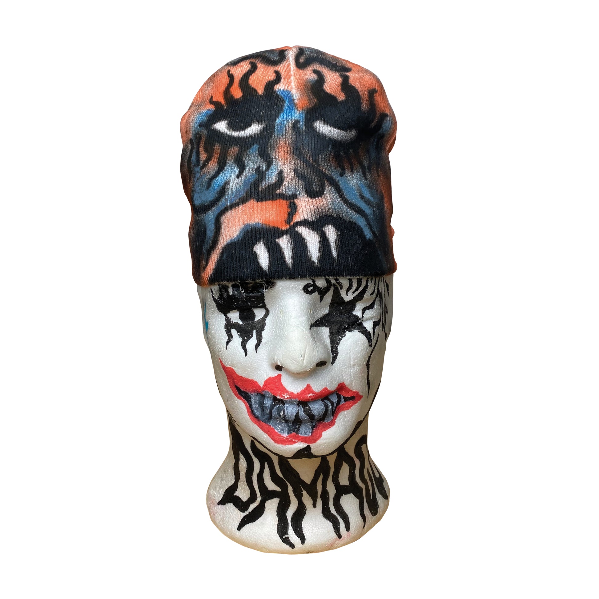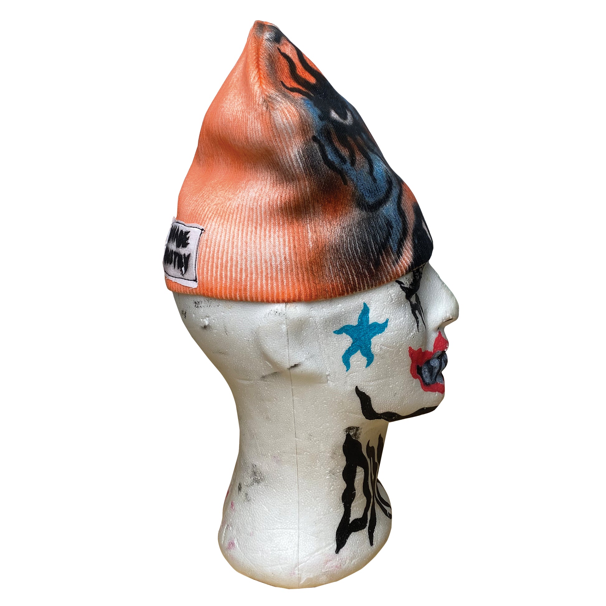 is a unique punk-style beanie featuring a one-of-a-kind airbrush design with a doubtful face. Its lightweight fabric and adjustable fit provide maximum comfort, while its custom 1/1 design offers a truly unique twist on the classic beanie.